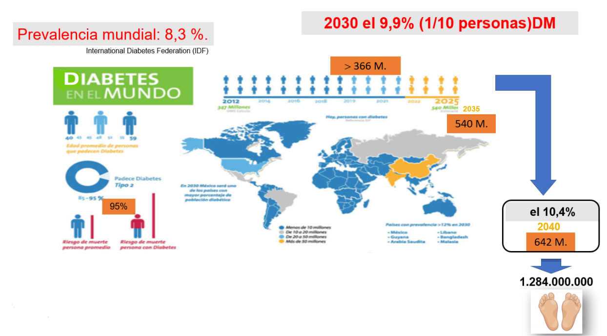 En la actualidad la IDF (International Diabetes Federation) cifra la prevalencia de diabetes en un 8,3%, esperando un aumento de esta a 9,9% en 2030 y de 10,4% en el 2040, lo que supone unos 642 M de pacientes diabéticos y la escalofriante cifra de 1.284.000.000 de pies susceptibles de sufrir lesiones. (1), (2)